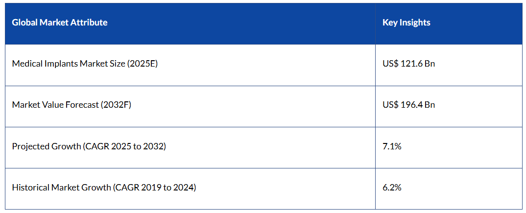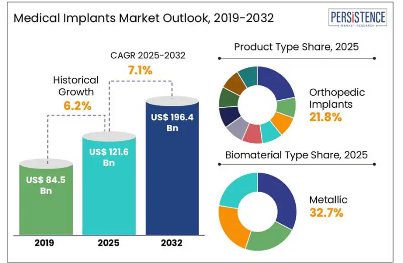 世界の医療用インプラント市場規模は、2025年の1,216億ドルから2032年までに1,964億ドルへ拡大すると予測されております。