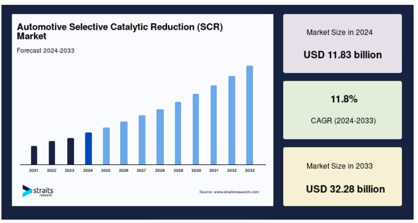 世界の自動車用選択的触媒還元(SCR)市場規模は、2024年に118億3,000万米ドルと評価され、2025年に132億2,000万米ドルから2033年に322億8,000万米ドルに達し、予測期間(2025年~2033年)において11.8%のCAGRで成長すると予測されています。