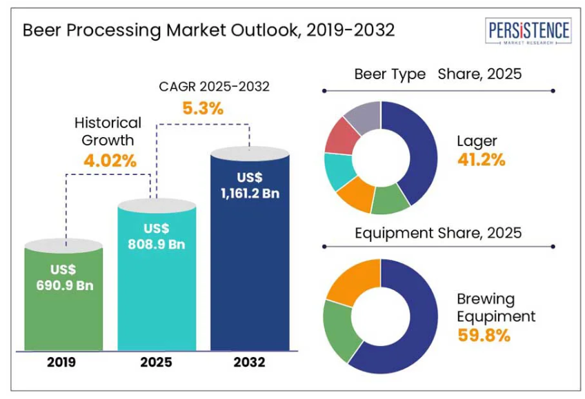 世界のビール加工市場規模は、2025年の8,089億ドルから2032年までに1兆1,612億ドルへ拡大し、この期間の予測年間平均成長率(CAGR)は5.3%と見込まれております。