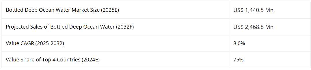 世界のボトル入り深海水市場は、8.0%の価値ベースの年平均成長率(CAGR)で拡大し、収益が2025年の14億4,050ドルから2032年までに約24億6,880ドルへと増加することが見込まれます。
