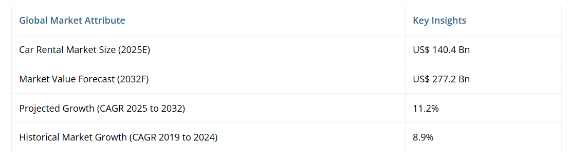 世界のレンタカー市場規模は、2025年の1,404億ドルから2032年までに2,772億ドルへ拡大すると予測されています。2025年から2032年までの予測期間において、年平均成長率(CAGR)11.2%で成長することが見込まれています。