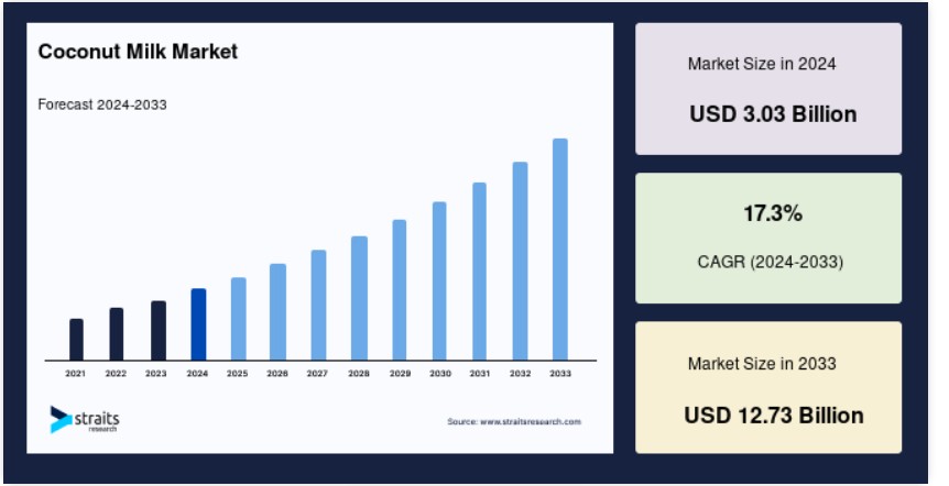 世界のココナッツミルク市場規模は、2024年には30億3000万米ドルに達し、2025年には35億5000万米ドル、2033年には127億3000万米ドルに達すると予測されています。予測期間(2025年~2033年)中のCAGRは17.3%で成長すると見込まれています。