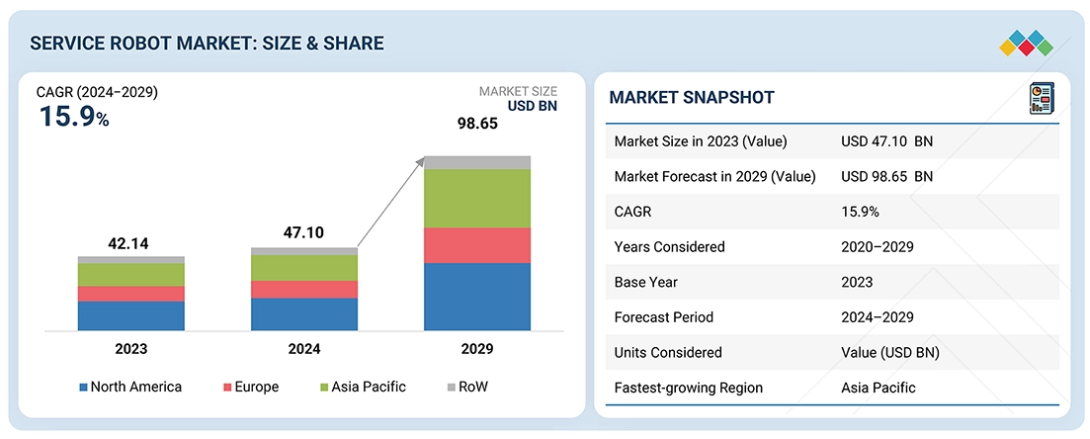 The service robot market is projected to reach USD 98.65 billion by 2029 from USD 47.10 billion in 2024, at a CAGR of 15.9% from 2024 to 2029. The rising adoption of robots in various verticals in order to gain higher return on investments is driving market growth.