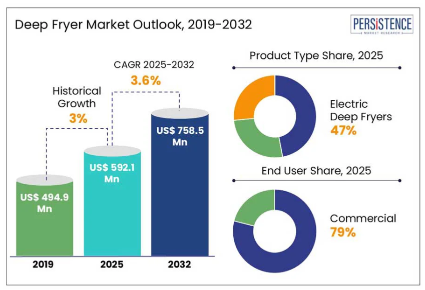 利便性、味、スピードが現代の調理習慣を定義する中、従来型から革新的なものまで、あらゆるタイプのフライヤーが世界中の家庭用キッチンや商業用フードサービス施設において不可欠な家電製品となりつつあります。世界には主要ブランドや地域チェーンが運営する30万以上のファストフードチェーン店舗が存在します。