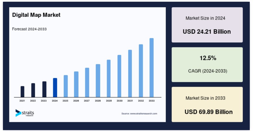 世界のデジタル地図市場規模は、2024年に242億1,000万米ドルと評価され、2025年に272億4,000万米ドルから2033年に698億9,000万米ドルに達し、予測期間(2025年~2033年)において12.5%のCAGRで成長すると予測されています。