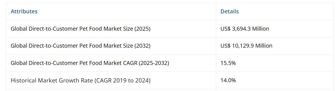 市場調査および競合情報プロバイダーであるPersistence Market Researchによるダイレクト・トゥ・カスタマー(DTC)ペットフード市場調査によれば、2019年から2024年にかけて、DTCペットフード市場の価値は約14.0%のCAGR(年平均成長率)で増加しました。