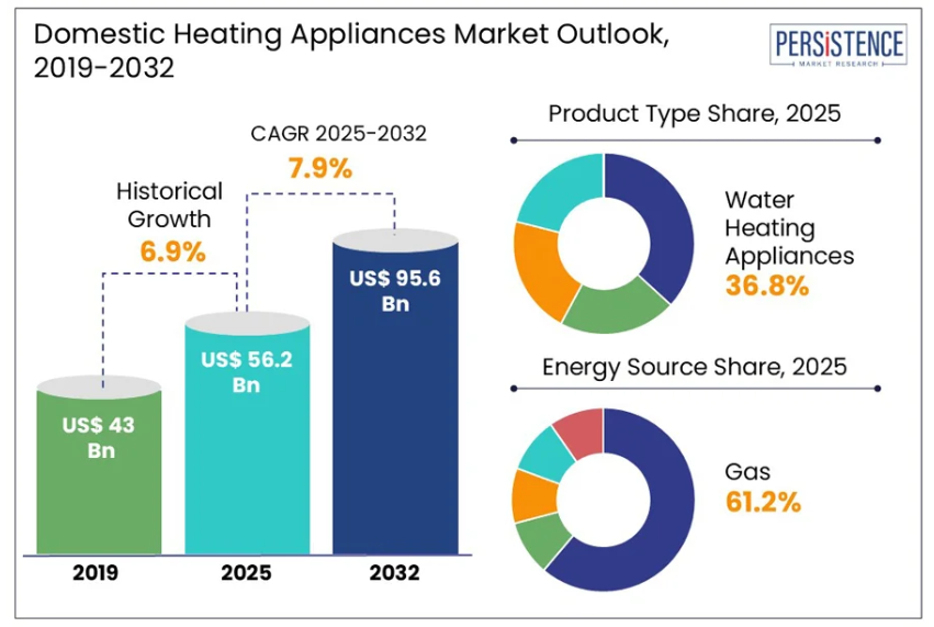 世界の家庭用暖房機器市場規模は、2025年の562億ドルから2032年までに956億ドルへ成長し、年平均成長率(CAGR)は7.9%と予測されております。パーシステンス・マーケット・リサーチの報告書によりますと、世界の家庭用暖房機器産業は、消費者の嗜好の変化、技術の進歩、そしてエネルギー効率への重視の高まりにより、大きな変革の過程にあります。