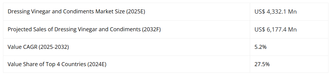 ドレッシング用酢および調味料市場は、5.2%の価値ベースの年平均成長率(CAGR)で拡大し、2032年までに収益が43億3210ドルから約61億7740ドルへ増加すると予測されます。