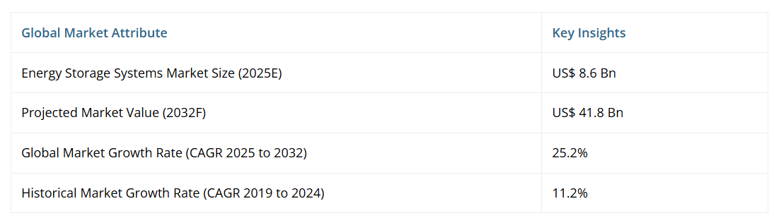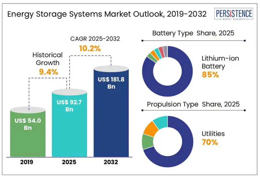 パーシステンス・マーケット・リサーチの報告書によりますと、世界のエネルギー貯蔵システム(ESS)市場は、2025年の86億ドルから2032年までに年平均成長率(CAGR)25.2%で418億ドルへと急成長すると予測されております。