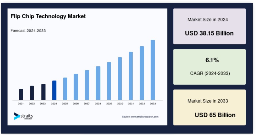 フリップチップ技術は、パソコンやゲーム機で使用されるグラフィックカードのプロセッサに統合されているため、現実世界でのゲームの人気が世界的に高まるにつれ、フリップチップ技術市場も発展すると予測されています。インテルやAMDなどの大手メーカーは、これらのチップの進歩を目指し、集中的な研究開発に多額の資金を投じています。さらに、フリップチップはスマートフォンに搭載されているセンサーにも組み込まれています。これにより、スマートフォンの動きに合わせてグラフィックが調整されるため、よりリアルなゲーム体験が可能になります。