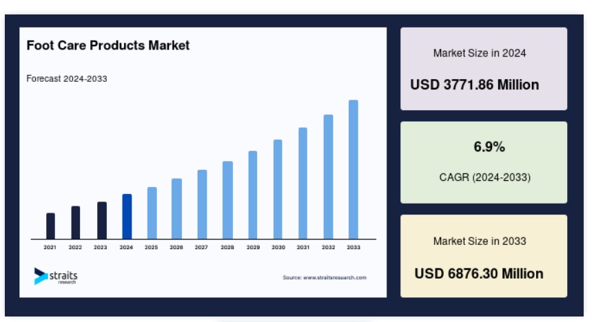 世界のフットケア製品市場規模は、2024年に37億7,186万米ドルと評価されました。2025年に40億3,212万米ドルから2033年に68億7,630万米ドルに達し、予測期間(2025年~2033年)において年平均成長率6.9%で成長すると予想されています。足健康と衛生の重要性に関する消費者の意識の高まりが、フットケア製品の需要を増加させています。医療機関や製品メーカーによる教育キャンペーンは、適切なフットケアのメリットを強調し、市場成長に寄与しています。