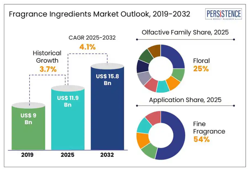 世界の香料原料市場規模は、2025年の119億ドルから2032年までに158億ドルへ拡大すると予測されています。2025年から2032年にかけて年平均成長率(CAGR)4.1%で成長すると見込まれています。パーシステンス・マーケット・リサーチの報告書によれば、変化する消費者の嗜好と産業の革新が、香料および香りのある製品への需要を後押ししています。