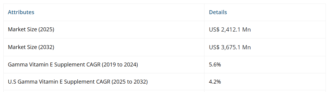 市場調査および競合情報プロバイダーであるPersistence Market ResearchによるガンマビタミンEサプリメント調査によれば、2019年から2024年までの期間において、ガンマビタミンEサプリメントの市場価値は約5.6%のCAGRで増加しました。予測期間中の絶対的なドル機会は15億ドルであり、2032年までに36億7510万ドルの市場規模に達すると予測されています。