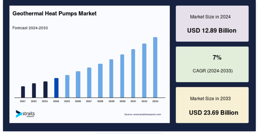 世界の地熱ヒートポンプ市場規模は2024年には128.9億米ドルと評価され、2025年には137.9億米ドルから2033年には236.9億米ドルに達すると予測されています。予測期間(2025年~2033年)中のCAGR(年平均成長率)7%で成長すると予測されています。