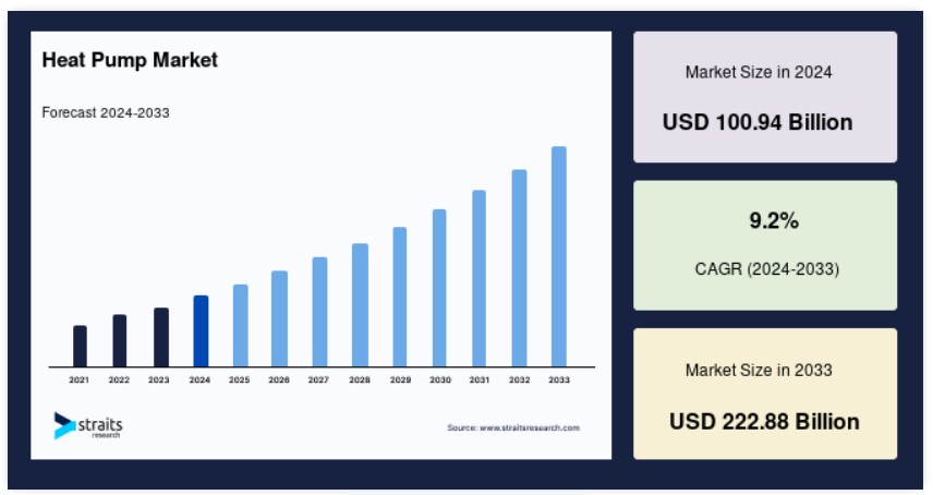 世界のヒートポンプ市場規模は、2024年に1,009億4,000万米ドルと評価され、2025年に1,102億3,000万米ドルから2033年に2,228億8,000万米ドルに達し、予測期間(2025年~2033年)において年平均成長率(CAGR)9.2%で成長すると予測されています。