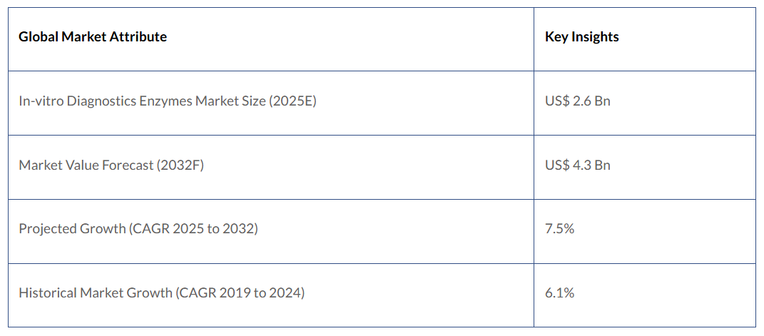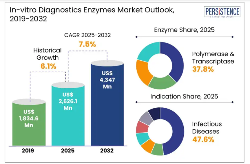 パーシステンス・マーケット・リサーチの報告書によりますと、世界の体外診断用酵素市場は、2025年の26億ドルから2032年までに43億ドルへ成長すると予測されております。