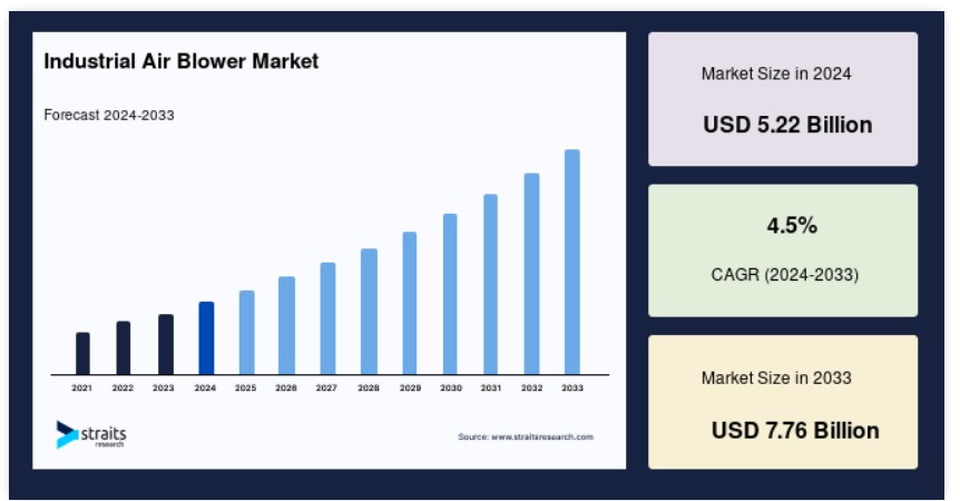 世界の産業用エアブロワー市場規模は2024年に52億2,000万米ドルと評価され、年平均成長率4.5%で成長しており、予測期間(2025年~2033年)には2025年に54億6,000万米ドルから2033年に77億6,000万米ドルに達すると予測されています。
