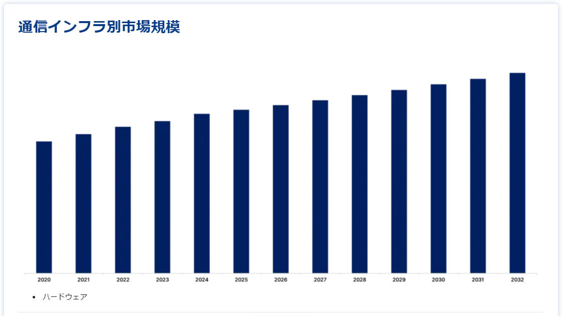 5Gインフラは、IoTデバイス、半自律走行車、拡張現実を動かす大きなデータストリームに低遅延カバレッジを提供する。 モバイルネットワークの第5世代技術標準に必要な、エッジの計算能力を備えたマクロおよびスモールセル基地局のネットワークは、5Gインフラと呼ばれる。 高速ネットワーク接続に対する需要の高まりにより、企業は業務効率を高め、プロセスコストを削減するために、アップグレードされたネットワークインフラを導入するようになっている。 このように、顧客に強化されたサービスを提供するために、企業全体でアップグレードされたネットワーク・インフラストラクチャの導入が堅調であることから、世界的に5Gインフラストラクチャの需要が高まると推定される。