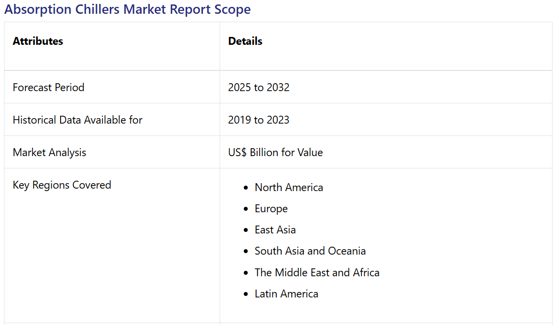 Absorption Chillers Market by Power Source (Direct Fired, Non-industrial, Water Driven), Application (Industrial, Non-industrial), Absorber Type (Lithium Bromide, Ammonia), Technology (Single Stage, Double Stage), and Regional Analysis from 2025 to 2032