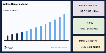 グローバルアクションカメラ市場は、2024年に25.5億米ドルの規模に達し、2025年には27.8億米ドル、そして2033年までに54.9億米ドルへと成長し、予測期間(2025年~2033年)において年平均成長率(CAGR)8.9%を記録すると予測されています。アクションカメラは、高解像度(HD)デジタルカメラの一種であり、ライブアクティビティの撮影に特化して設計されています。これらは、コンパクトで携帯性に優れ、軽量であるという特徴を持ち、動きの速い環境や過酷な条件下での動画撮影に非常に適しています。サイクリング、スカイダイビング、スケート、クライミング、サーフィンといった多様なアドベンチャースポーツやアクティビティの記録に用いられます。