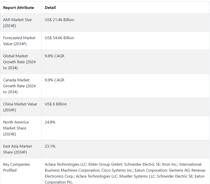 世界の高度計測インフラストラクチャ(AMI)市場は、2024年の評価額214.6億ドルから、2034年末には546.6億ドルに拡大すると予測されている。 市場は2024年から2034年までCAGR9.8%で拡大すると分析されている。