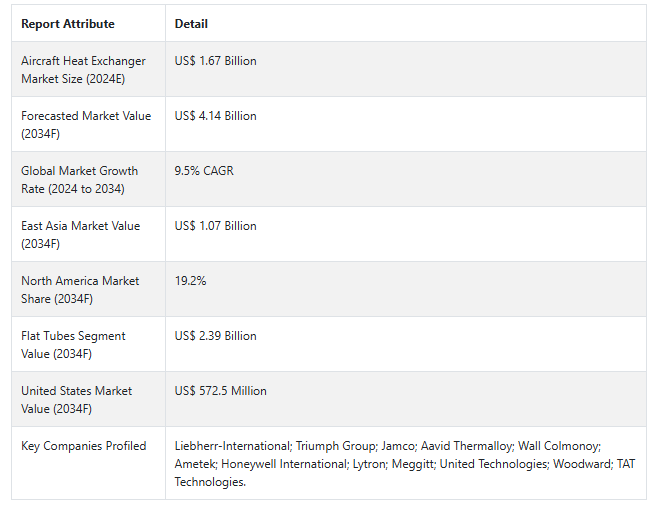世界の航空機用熱交換器市場は、2024年には現在16億7000万米ドルと評価されており、年平均成長率9.5%で拡大し、2034年には41億4000万米ドルに達すると予測されています。