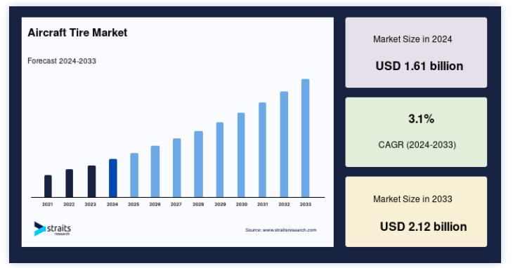 世界の航空機用タイヤ市場規模は、2024年には16億1000万米ドルと評価され、2025年には16億6000万米ドルから21億2000万米ドルに達すると予測されており、予測期間(2025年~2033年)中の年平均成長率(CAGR)は3.1%で成長すると見込まれています。