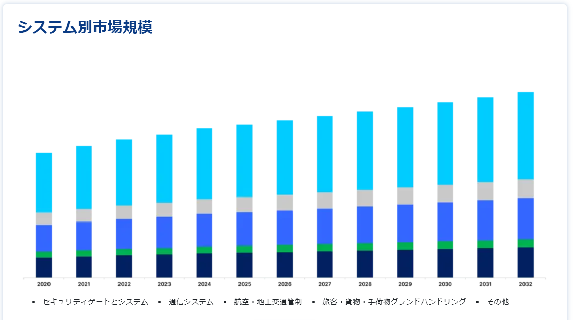 空港オートメーション市場には、空港業務の合理化と強化を目的としたさまざまな技術とシステムが含まれる。 これには、自動チェックイン・キオスク、手荷物処理システム、セキュリティ・スクリーニング技術、自動搭乗ゲートなどが含まれる。 この市場の成長を牽引しているのは、効率的でコスト効率の高い空港運営に対する需要の高まりと、増加する旅客数を最小限の遅延で処理する必要性である。