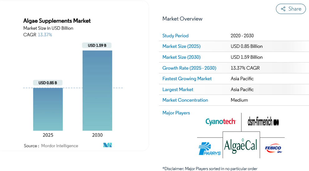 藻類サプリメント市場の規模は、2025年に8億5,000万米ドルと評価され、2030年までに15億9,000万米ドルに達すると予測されており、年平均成長率(CAGR)13.37%で拡大しています。この二桁成長の軌跡は、持続可能な植物由来栄養への消費者関心の高まり、新規藻類種の迅速な規制認可、そして栄養密度を維持しつつコスト曲線を圧縮する抽出効率の着実な向上を反映しています。