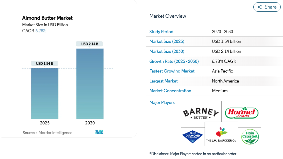 世界のアーモンドバター市場は中程度の分散状態にあり、多国籍企業と専門ブランドが市場シェアを争っています。ブルーダイヤモンド・グローワーズ、J.M.スミュッカー・カンパニー、ホーメル・フーズ・コーポレーション(ジャスティンズを通じて)は、確立された流通網、小売パートナーシップ、ブランド認知度を通じてアーモンドバター分野での市場リーダーシップを維持しています。これらの企業は、クリーンラベルや植物性栄養への消費者嗜好に沿った新フレーバー、包装、製品バリエーションの導入に事業規模を活かしています。研究開発とマーケティングへの投資は顧客関係の強化と新規市場への進出を促進し、高級食料品チェーンやオンラインプラットフォームにおける小売展開により、製品の広範な入手可能性を確保しています。こうした市場存在感と適応力の組み合わせにより、小規模メーカーに対する競争優位性を維持し、世界中の多様な消費者層に対応しています。