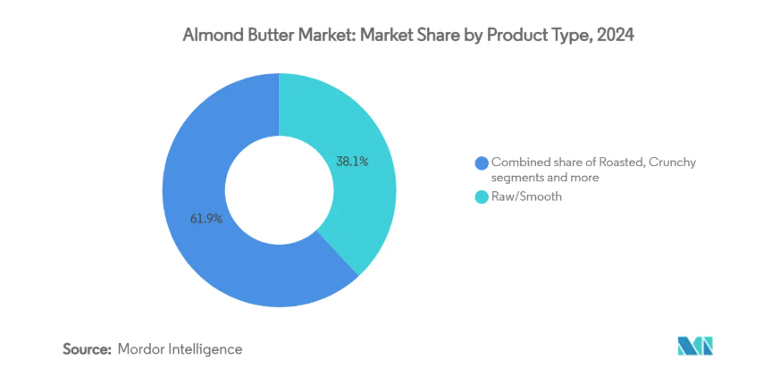製品メーカーは、フレーバー付きアーモンドバターの品揃えにおいて著しい成長を遂げており、8.23%のCAGRを達成し、従来型を上回っています。消費者は従来のスプレッドに代わる栄養価の高い代替品をますます求めるようになり、メーカーは製品ポートフォリオの拡大を迫られています。American Dream Nut Butterのような企業は、クッキー&クリーム、コンフェッティケーキポップ、チョコレートブラウニー、ミントチョコレート&ドリーム、シナモントーストなど、多様なフレーバーを導入することでこの需要に対応しています。カリフォルニアアーモンド協会によれば、2023年には14,000種類の新食品にアーモンドが使用され、製品開発における重要性が示されています[3]。アーモンドバター市場では、メーカー各社がスパイスやフルーツを配合した多様なフレーバーの組み合わせを導入し、単回分パックなどの新たな包装ソリューションを開発しています。また、加工技術、特に粒子サイズの微細化における進歩により、製品の食感と滑らかさが向上しています。こうした技術的進歩は、脂質吸収や栄養素利用効率の向上など、官能特性と潜在的な栄養的利点の両方を高めています。さらにメーカーは、革新的な風味と先進的な加工手段を組み合わせ、独自の市場ポジションを確立しています。これにより小売業者や外食産業は、大胆な風味とクリーンラベル原材料を特徴とする製品を提供することで、このトレンドを活用しています。こうした展開は、健康と味の両方を重視する消費者にとって、スプレッドカテゴリーにおけるプレミアム選択肢としてのアーモンドバターの地位を強化しています。