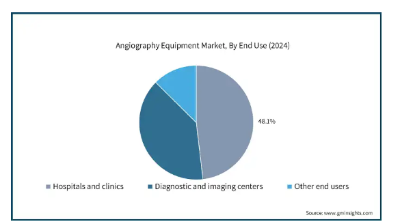 エンドユーザー別では、血管造影装置市場は病院・診療所、診断・画像診断センター、その他のエンドユーザーに区分されます。病院・診療所セグメントは2024年に48.1%のシェアで市場を支配。