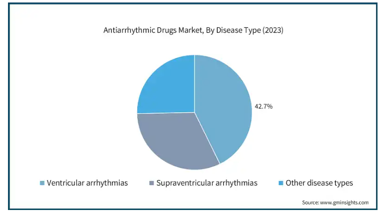 疾患の種類別では、抗不整脈薬市場は心室性不整脈、上室性不整脈、その他の疾患に区分されます。心室性不整脈分野が市場を支配し、2023年の売上高は4億2970万米ドルで最大。