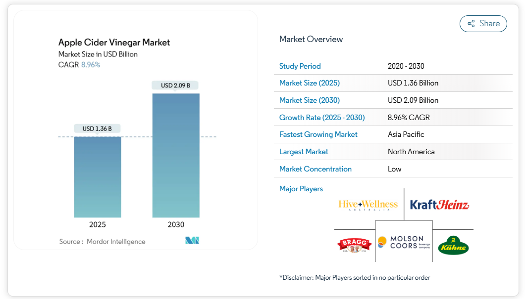リンゴ酢の市場規模は2025年に13億6,000万米ドルと評価され、2030年までに20億9,000万米ドルに達すると予測されています。予測期間中は年平均成長率(CAGR)8.96%で成長が見込まれます。市場成長は、機能性飲料や自然健康製品に対する消費者需要の高まりに牽引されており、リンゴ酢の代謝・消化器系健康効果を実証する広範な研究がこれを支えています。クリーンラベル製品への消費者嗜好の高まり、有機食品消費の著しい成長、電子商取引チャネルの広範な拡大が市場発展に大きく寄与しています。