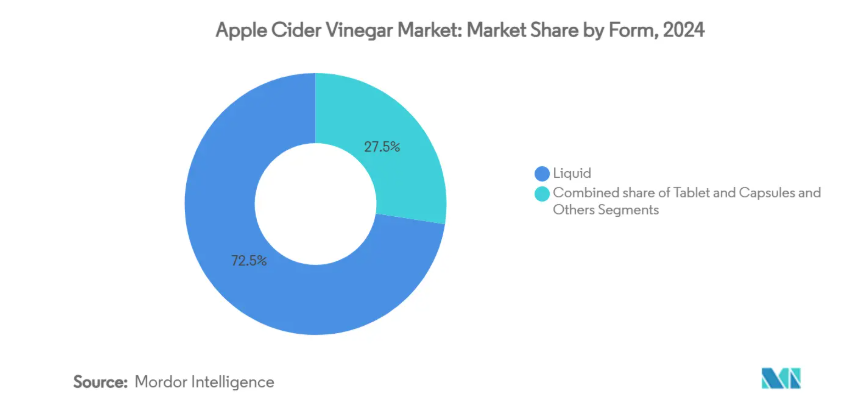 液体リンゴ酢は2024年に72.54%の市場シェアを占め、消費者の親しみやすさと従来型発酵製品の本物感への認識を反映しています。一方、錠剤、カプセル、グミなどの代替形態は、2030年まで年平均成長率9.45%で拡大しています。液体形態は、バルク包装とコスト効率の高さから、産業および料理用セグメントで主流を占めています。炭酸飲料への酢酸添加による市場拡大が進み、消費者受容度が高まっています。小売業者がサプリメントコーナーを拡充し、これらの製品を体重管理商品と並べて陳列する動きに伴い、リンゴ酢市場の錠剤・カプセルセグメントはシェア拡大が見込まれます。