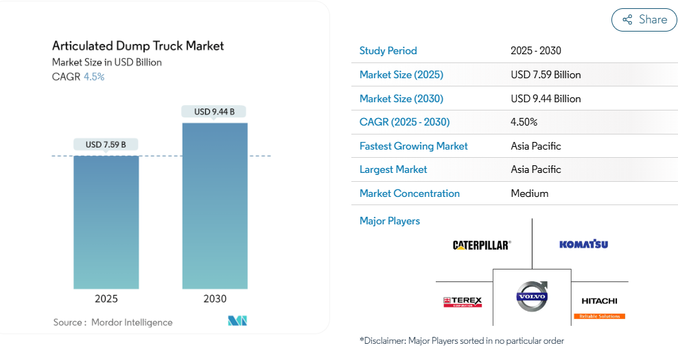 関節式ダンプトラック市場規模は、2025年に75億9,000万米ドルと推定され、予測期間(2025-2030年)において年平均成長率(CAGR)4.5%で推移し、2030年までに94億4,000万米ドルに達すると見込まれております。