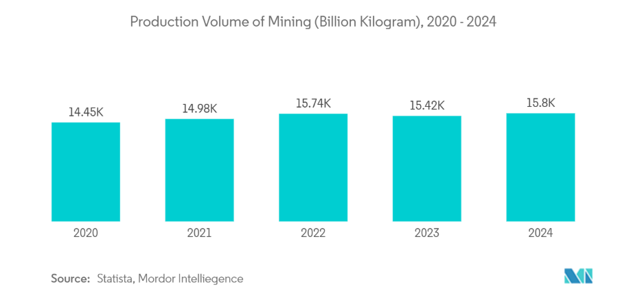• 鉱業生産の増加は、工業化や都市化の進展、エネルギー資源への需要拡大といった要因に起因しており、これらが相まって世界的な鉱物・鉱石の採掘を促進しています。さらに、新興経済国における鉱業活動の拡大と鉱業インフラへの投資が相まって、生産量の水準が着実に成長する一因となっています。