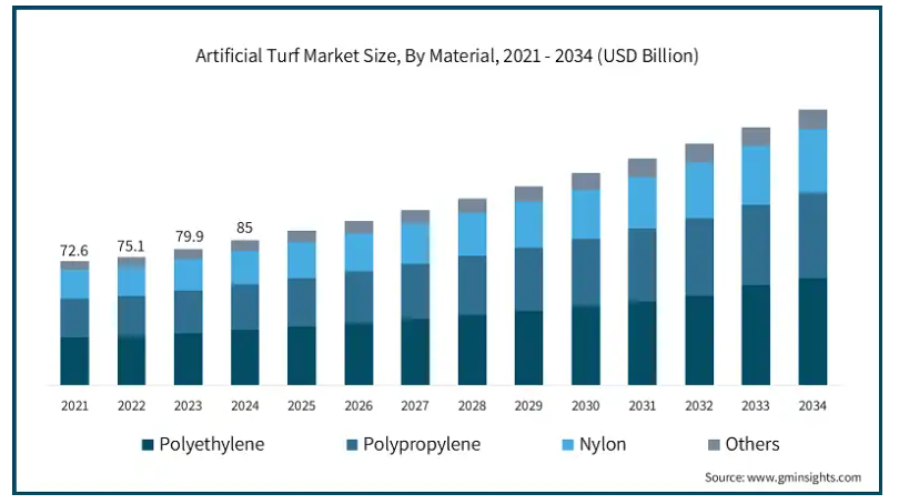 人工芝業界のトレンドは、持続可能性とイノベーションへの注目の高まりを強調しています。環境意識の高まりから、環境に優しい素材やインフィル(詰め物)のオプションが人気を集めています。一方、芝の設計と製造における技術的な進歩は、よりリアルで耐久性のある表面を生み出しています。市場の裾野は広がり、従来のスポーツフィールドや造園だけでなく、家庭用芝生、レクリエーションエリア、教育機関などにも広がっています。