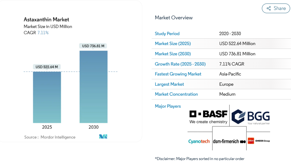 合成品がコスト重視の飼料分野で依然として主流である一方、技術革新により価格差は着実に縮まりつつあります。微細藻類の培養技術、AI最適化光生物反応器システム、深共晶溶媒などの環境に優しい抽出技術における飛躍的進歩は、運用コスト削減だけでなく、持続可能性と拡張性の向上にも寄与しています。こうした進展と、自然由来の機能性成分を求める消費者嗜好の変化が相まって、栄養補助食品、機能性食品、高級スキンケア製品など、新たな収益源が開拓されつつあります。科学的に裏付けられた高成長ポテンシャルを持つ健康素材への参入を検討されている企業様にとって、アスタキサンチンは革新性、消費者からの信頼、規制面での進展を基盤とした魅力的な成長ストーリーを提供します。