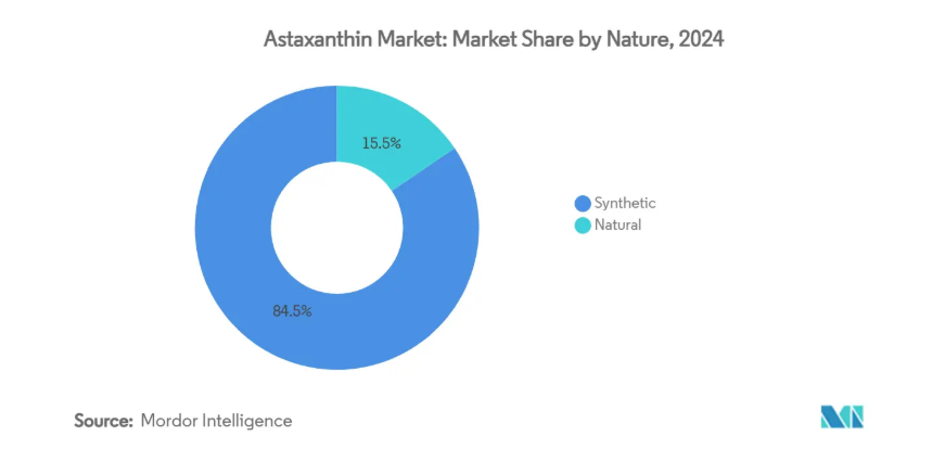 合成アスタキサンチンセグメントは2024年に84.47%の市場シェアを占めました。これは、養殖加工業者に安定したコストと発色性を供給する確立された化学合成生産ラインに支えられたものです。製造プロセスは数十年にわたりほぼ変化がなく、メーカーに信頼性の高い生産方法と標準化された品質を提供しています。