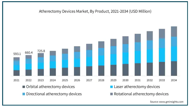 この調査レポートは、アテレクトミー装置市場を詳細に調査し、2021年から2034年にかけての収益予測(百万米ドル)を掲載しています: