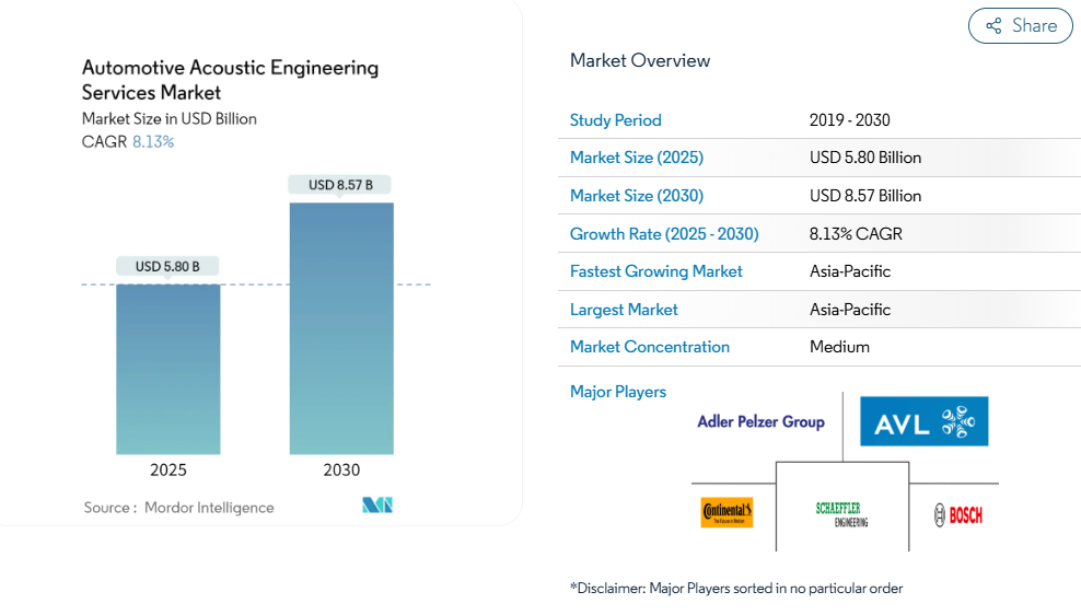 自動車音響エンジニアリングサービス市場規模は、2025年に58億米ドルと推定され、予測期間(2025-2030年)において年平均成長率(CAGR)8.13%で推移し、2030年までに85億7,000万米ドルに達すると見込まれております。