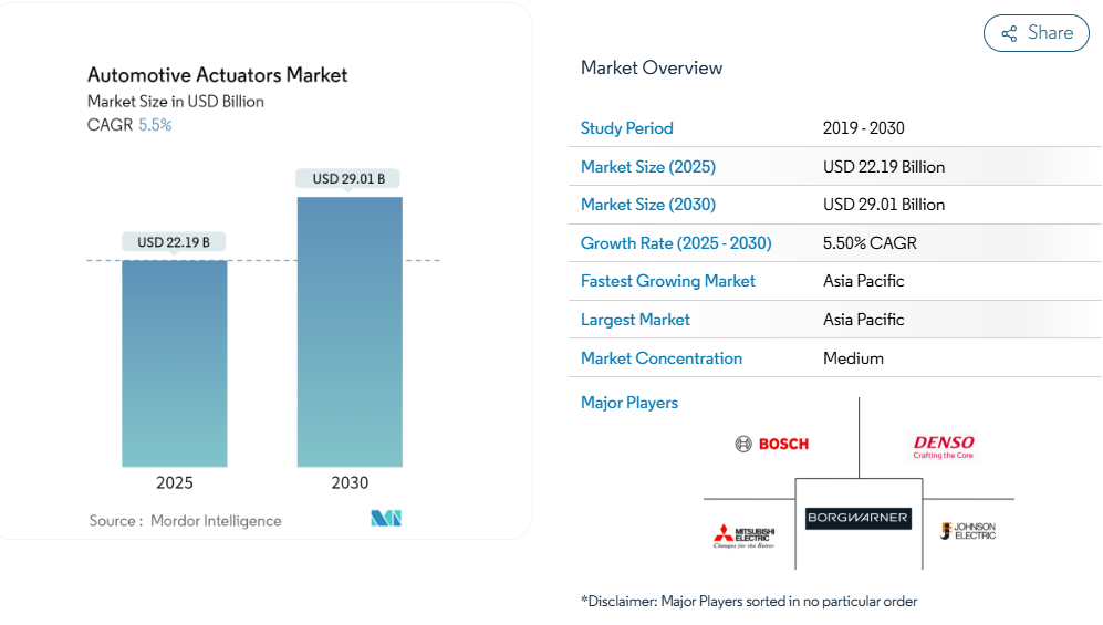 自動車用アクチュエーター市場は中程度の集中化が進んでいます。ボッシュ、デンソー、コンチネンタルは化学、機械、ソフトウェアの専門知識を網羅し、規模の優位性を維持しています。ボルグワーナーは、アクチュエーター機能を統合した高電圧ヘアピンモーターと電動クロスディファレンシャルにより、2027年までに100億米ドルのeプロダクト収益を目標としています[3]。ZFの大規模なブレーキ・バイ・ワイヤ契約は、OEMが完全電子式安全システムに信頼を寄せていることを示し、油圧システムの優位性を侵食しています。