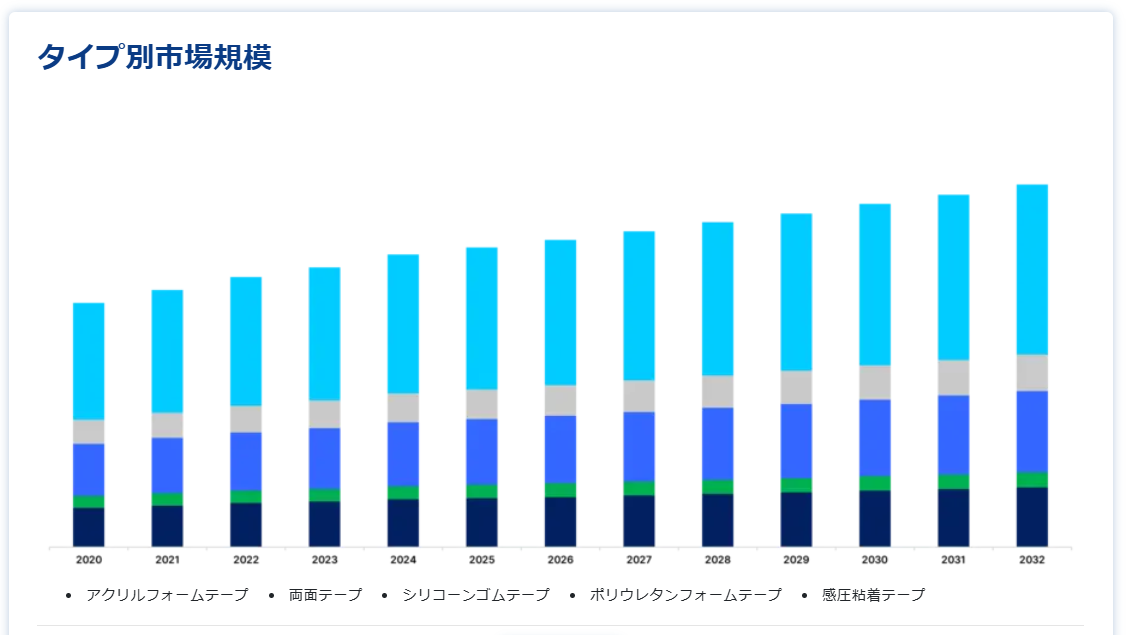 自動車用粘着テープは、異なる粘着化学から成る頑丈な粘着テープであり、主に結束やラッピングに使用され、あらゆる自動車製品の内外装の保護層として機能する。 自動車産業は、自動車の軽量化、騒音の低減、燃費とユーザーエクスペリエンスを向上させるための結合の剛性と長寿命化など様々な問題に直面しており、そのため自動車用粘着テープの重要性が高まっている。