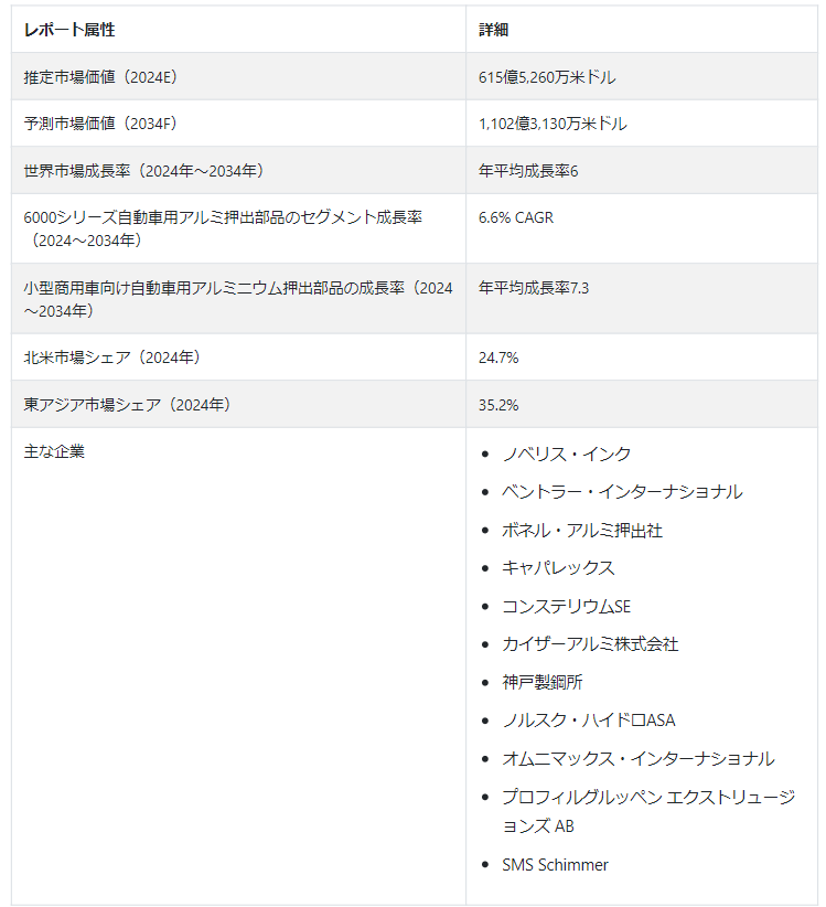 2034年の自動車用アルミ押出部品市場の予測値は?