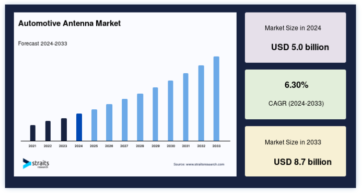 世界の自動車用アンテナ市場規模は2024年に50億米ドルと評価され、2025年の53億米ドルから2033年には87億米ドルに達すると予測されており、予測期間(2025年~2033年)中の年平均成長率(CAGR)は6.30%で成長すると予測されています。