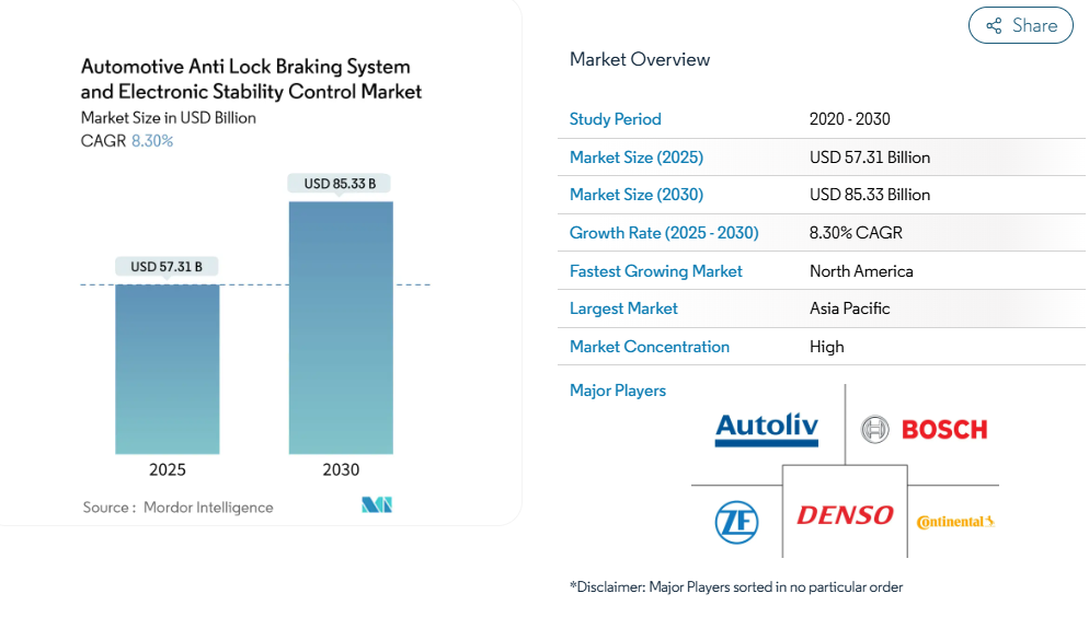 成長の基盤は、義務化された安全規制、ブレーキ・バイ・ワイヤ設計を促進する電動化プラットフォーム、そして世界的な自動車生産の着実な回復にあります。欧州連合(EU)、米国、インド、中国の規制当局は現在、ABSをより広範なアクティブセーフティ機能群の基盤と位置付けており、これにより自動車メーカーは事実上すべての新車セグメントにABSを組み込むよう促されています。