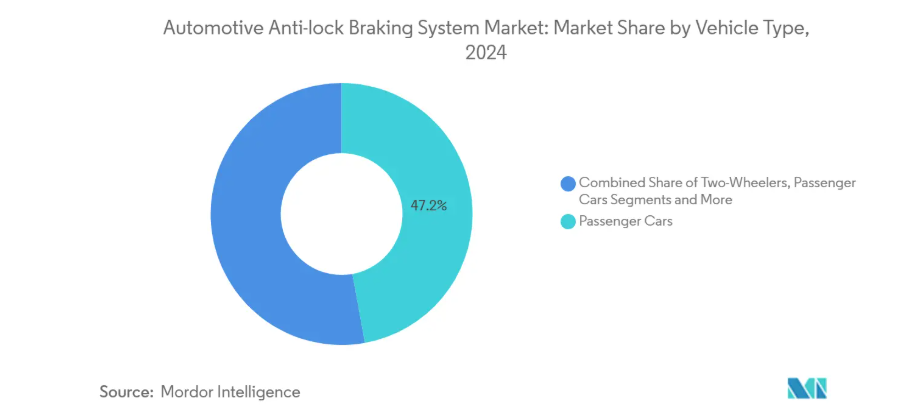 乗用車は2024年、ヨーロッパ・中国・北米における義務化により47.15%の収益を占め、自動車用アンチロック・ブレーキ・システム市場を支えました。安定した自動車需要と高度化する運転支援パッケージが、継続的な収益基盤を確保しています。このセグメントはADAS普及と連動して成長しますが、二輪車ほどの速さではありません。乗用車向け自動車用アンチロック・ブレーキ・システム市場規模は、レーンキープ機能やアダプティブ・クルーズ・コントロール機能とのブレーキ制御統合をOEMが推進するため、年平均成長率(CAGR)8.10%で拡大すると予測されます。