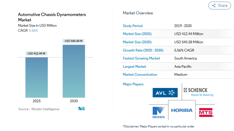 自動車用シャーシダイナモメーター市場は中程度の集中状態にあります。単独シェアが25%を超える企業は存在せず、差別化技術や地域専門企業の参入余地を示唆しています。顧客は価格のみではなく、精度・再現性・広範な実験室エコシステムとのシームレスな統合性を重視するため、競争は技術革新へと向かっています。主要ベンダーの多くは垂直統合を推進し、ハードウェア上にソフトウェア、校正サービス、データ分析層をバンドルしています。堀場製作所は70年にわたる計測技術を活用し、排出ガスからバッテリーまでのターンキー試験環境を提供するとともに、リアルタイム分析スイートで合格/不合格判定を迅速化しています。AVL社は10kWのマイクロモビリティ用モーターから140MWの船舶エンジンまで対応するモジュラー型SPECTRAダイナモを推進し、自動車顧客に電力密度管理における業界横断的な知見を提供しています。中小企業は基礎工事不要のハブダイナモや軌道側検証を支援する移動式トレーラーをカスタマイズし、地域別のニッチ市場を開拓しています。