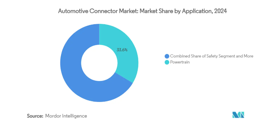 パワートレイン用途は、2024年の自動車コネクター市場規模において33.60%と最大のシェアを維持しており、内燃機関(ICE)およびハイブリッドパワートレイン双方において、エンジン管理、トランスミッション制御、燃料噴射システムの重要性が継続していることを反映しています。しかしながら、ADASおよび自動運転システムは、高度な安全機能に関する規制要件と、自動車の自動化レベル向上に向けた業界の進展を背景に、2025年から2030年にかけて年平均成長率17.8%で最も急速に成長するセグメントとして台頭しております。